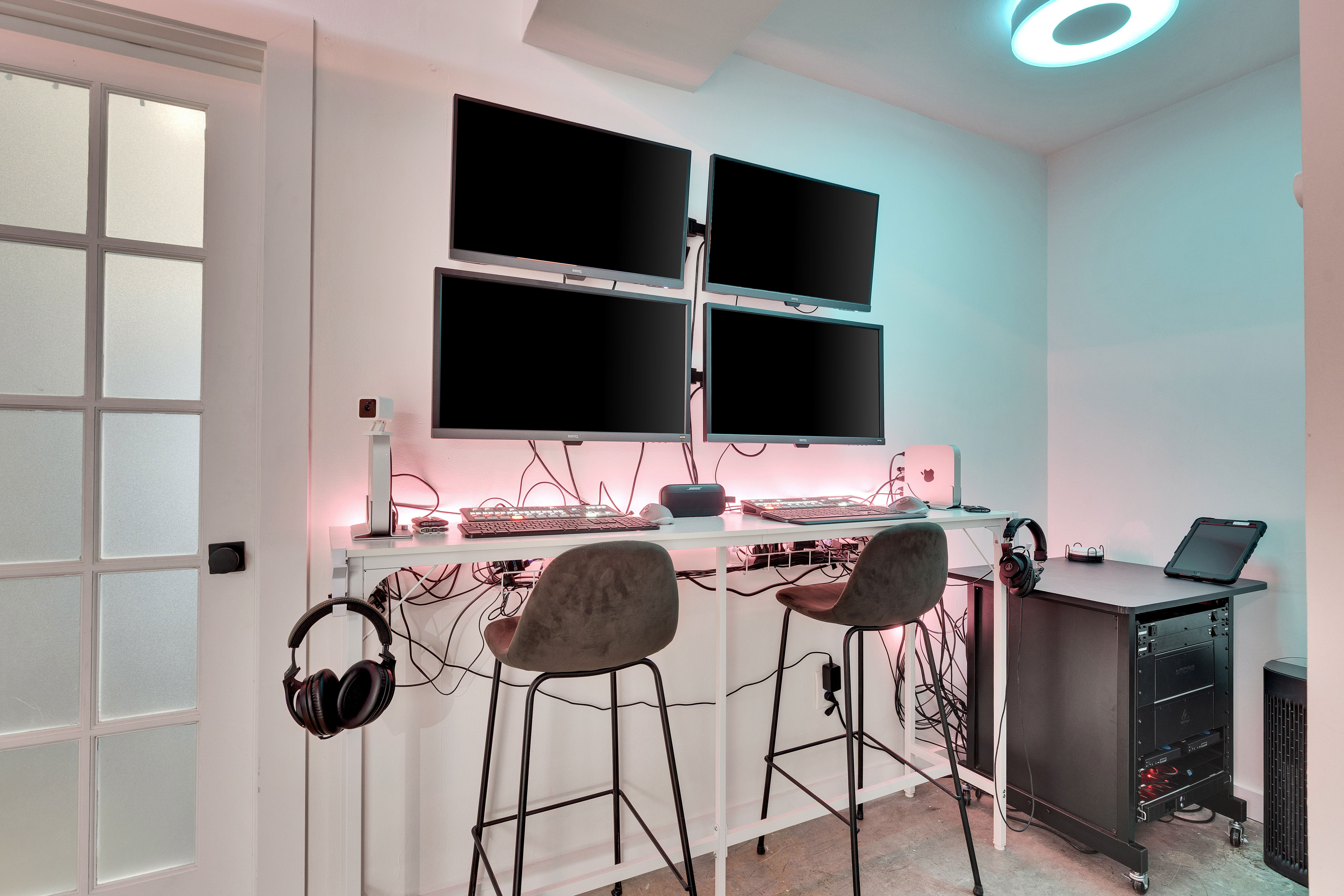 The space fits up to 3 people on camera in a fully lit white cyclorama setup. The seamless white wall can be transformed into any color using built-in RGB lighting, giving your content a branded or bold visual identity without post-production color work. The studio is pre-lit and engineered for speed — no lighting adjustments required.